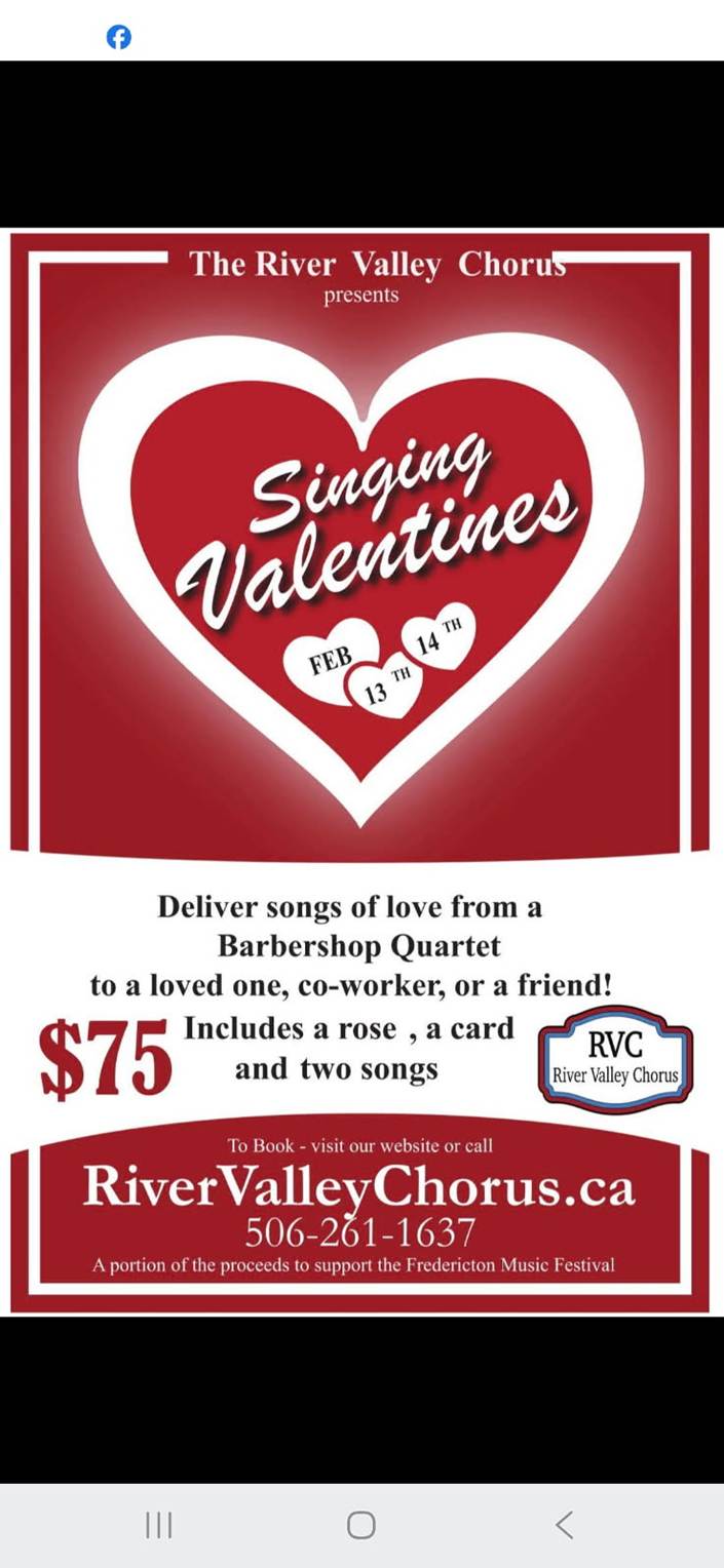 The River Valley Chorus is delivering Singing Valentines! Deliver songs of love from a Barbershop Quartet to a loved one, co-worker, or friend. Includes a rose, a card and two songs. $75. To book, visit RiverValleyChorus.ca or call 506-261-1637![]() | |||